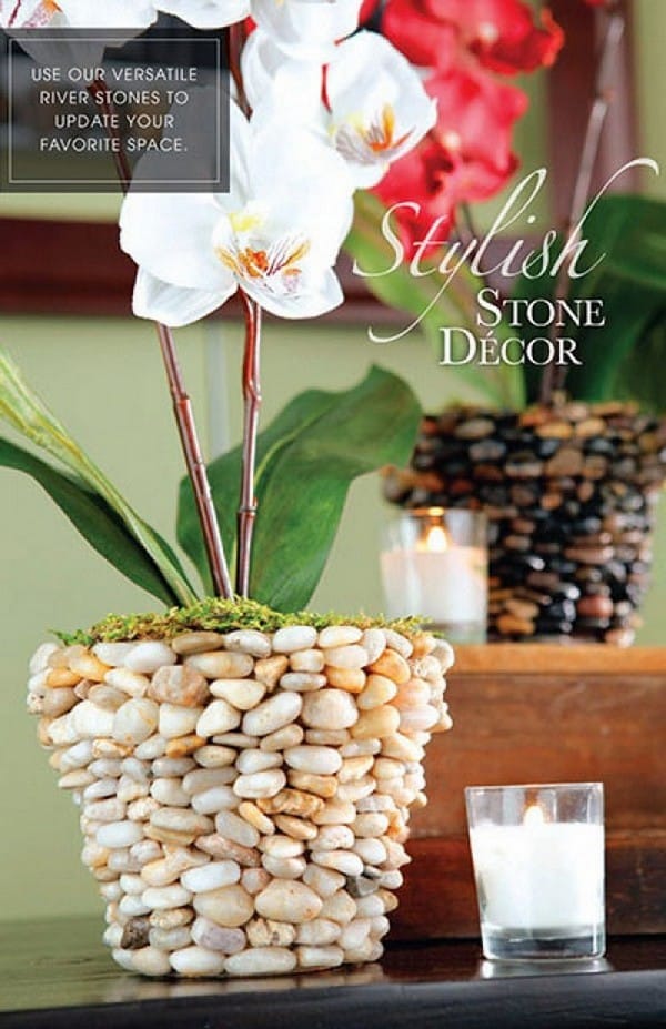 • Glue small pebbles around a recycled mason jar or bottle.