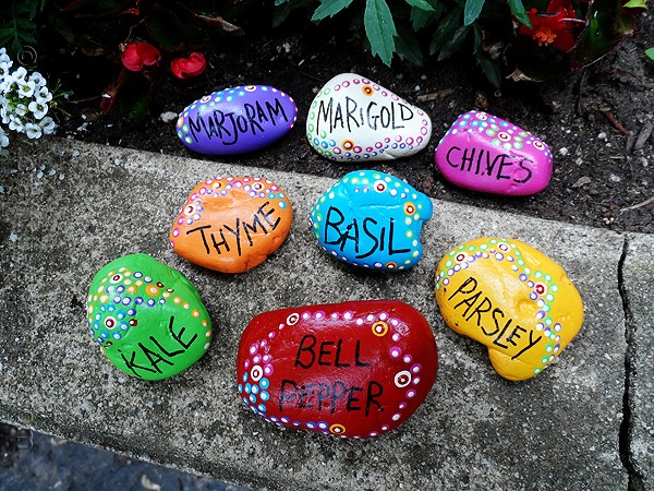 • Paint the names of plants or vegetables on them.
