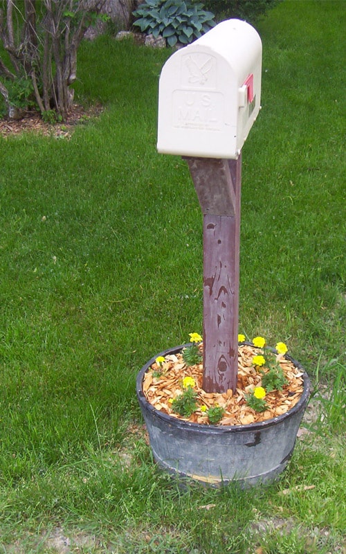 A washbin or galvanized metal tub makes a fantastic rustic planter for your mailbox! This vintage farmhouse look is simple, yet striking.