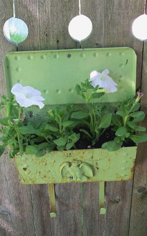 Give your old mailbox a rustic, farmhouse makeover by using a vintage tin container instead. Attach it to a wooden post or wall and fill it with cascading flowers to add charm to your garden.