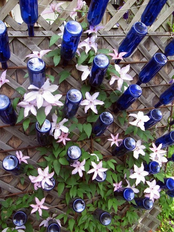 Mount glass bottles on a fence or garden wall to create an artistic vertical bottle tree, adding depth and texture to an otherwise plain surface.
