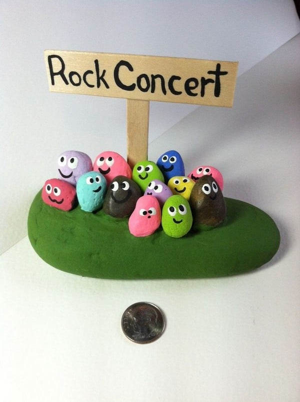 Paint small rocks with musical instruments and band characters to create a mini rock concert scene. Arrange them on a wooden stage or garden pathway for a playful and entertaining backyard display.