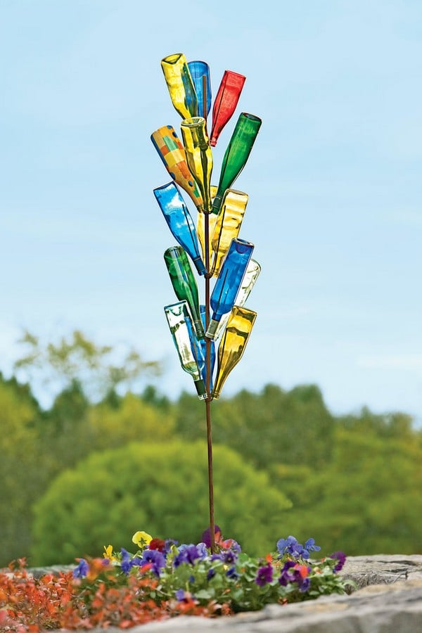 Turn colorful glass bottles into a beautiful garden tree by arranging them on metal rods or branches. This eye-catching display reflects sunlight, adding a magical glow to your backyard.
