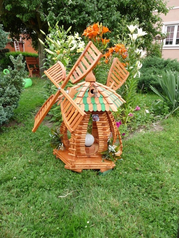Install a miniature windmill in your backyard for a farmhouse-style aesthetic. Choose a rustic metal or wooden design to add charm and movement to your outdoor space.