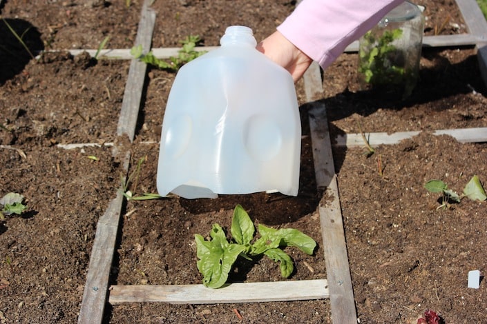 💡 Tip: Cut off the bottom of a plastic jug and place it over small plants to trap warmth.