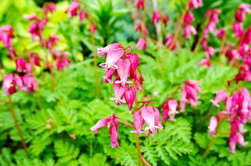 This fern-like, compact perennial features heart-shaped pink flowers with white tips. It blooms repeatedly throughout the season and performs well in shady areas.