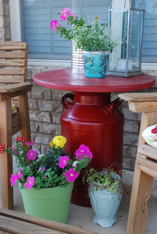 Turn a vintage milk can into a rustic patio table. Simply add a wooden or glass top, and you’ll have a sturdy, unique piece that fits any farmhouse or cottage-style decor.