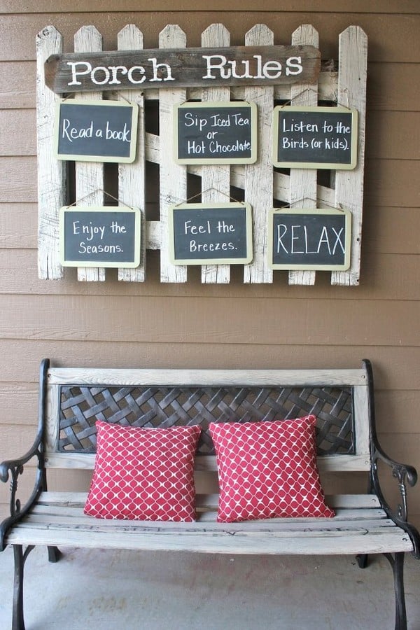 Add a personalized touch to your front porch by creating a DIY “Porch Rules” sign with quotes like “Relax, Sip, Laugh, and Enjoy”.