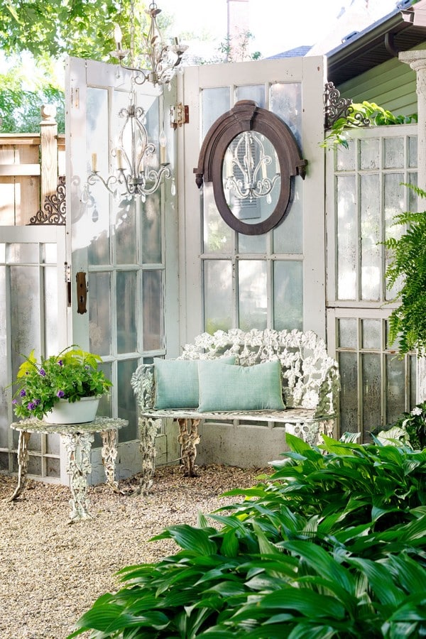 Use a DIY bench, comfortable chairs, and plenty of greenery to create a peaceful retreat.