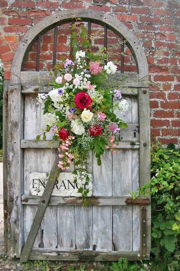A weathered barn door makes the perfect backdrop for climbing plants or hanging baskets.