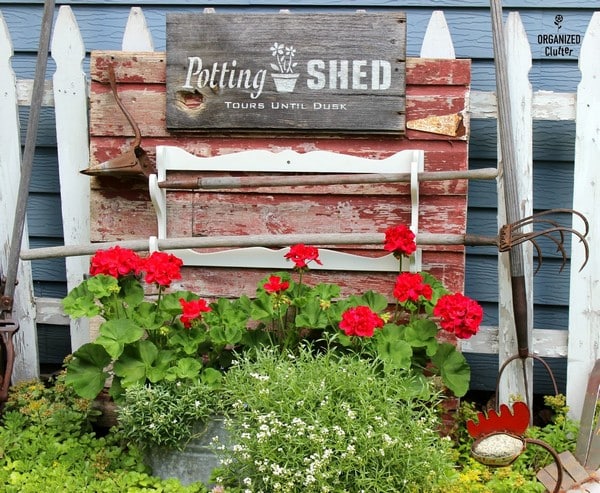 Give an old rusty cultivator a second life by using it as a decorative piece in your garden.