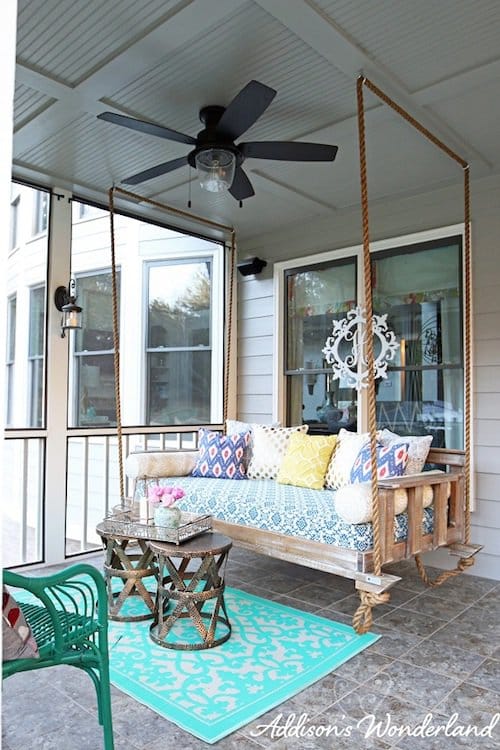 A swing chair made of rope adds a boho-chic vibe to your outdoor space.