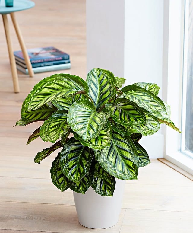Calatheas are prized for their intricately patterned foliage, ranging from pinstripes to peacock-like designs. These plants also fold their leaves up at night, adding to their charm.