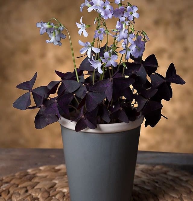 Oxalis features deep purple or green clover-like leaves that fold up at night and open during the day. It also produces delicate white or pink flowers, making it both unusual and ornamental.