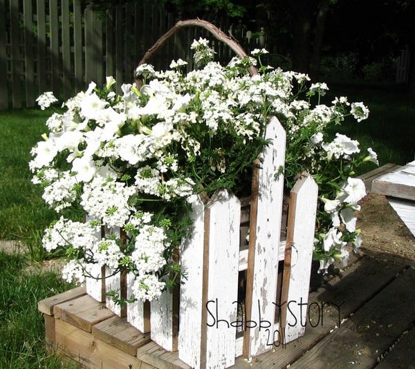 Craft a decorative planter basket using trimmed pickets. It works as a centerpiece for outdoor tables or as a front porch flower display.