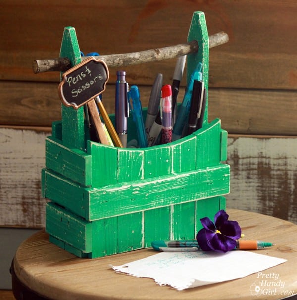 Make a portable garden tool tote using small fence boards. Include a handle across the top for easy carrying of tools, seeds, and gloves.