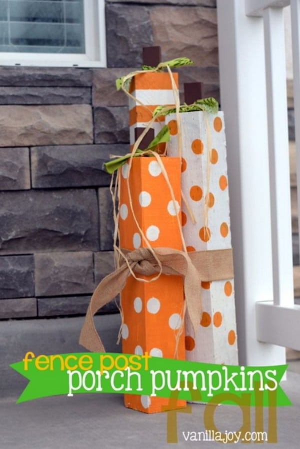 Create DIY porch pumpkins by cutting fence posts into different heights, painting them orange, and adding wooden or twine “stems.” These make perfect fall decor with a handmade touch.