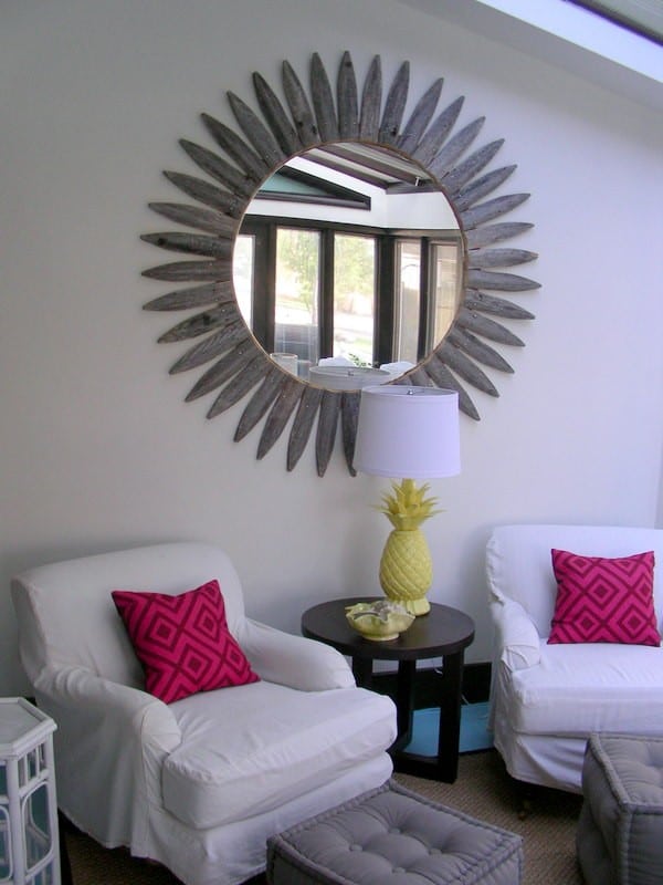 Turn short picket sections into a sunburst mirror frame. Attach the pieces in a radiating pattern around a circular mirror using wood glue and a sturdy backing.