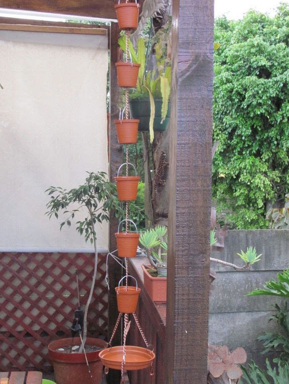 9. Stacked Mini Planters – A Functional Rain Chain