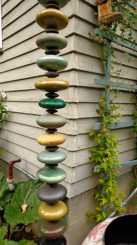 Handmade ceramic bowls, cups, or discs can be stacked and linked to create an artistic rain chain.