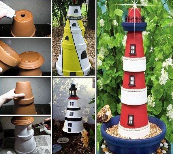 Stack various-sized clay pots to create a nautical-themed lighthouse for your garden.