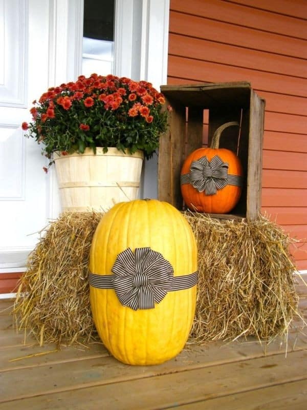 Create a warm and inviting entrance by arranging straw bales on both sides of your door, decorated with pumpkins, mums, and lanterns.