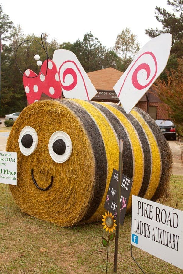 Turn a round hay bale into an adorable giant bumblebee using paint, wings, and antennas—perfect for kids’ gardens and farm-themed displays.