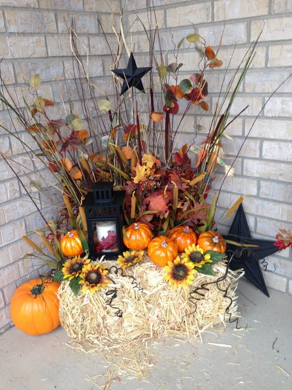 Transform your porch into a cozy fall haven by arranging straw bales, pumpkins, lanterns, and mums.