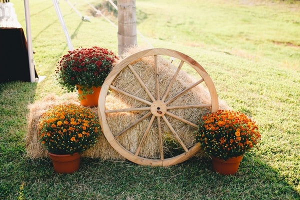 Pairing old wagon wheels with stacked straw bales creates a beautiful country-style focal point.