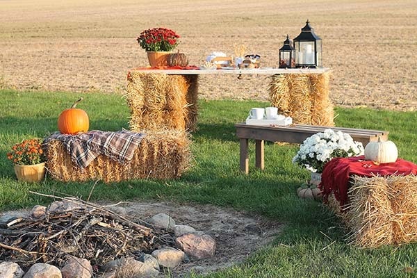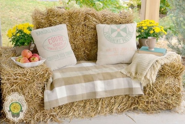 Stack straw bales in an L-shape or U-shape, then add cozy cushions to create a rustic outdoor sofa for fall evenings under the stars.