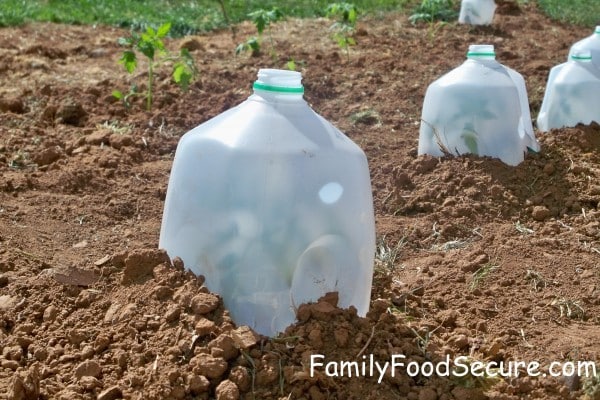 - Cut the bottom off a milk jug and place over seedlings.
