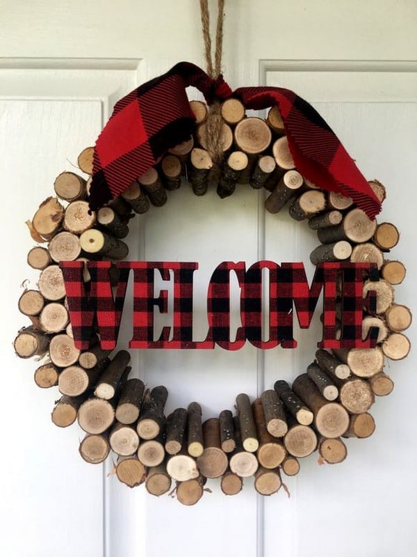 Craft a stunning rustic wreath using small log slices and other natural materials like pinecones, twigs, and dried flowers. Hang it on your door for a warm and inviting entrance.