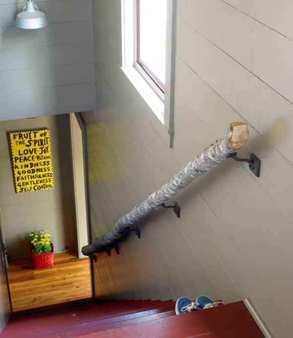For a truly unique and organic staircase, use a sturdy log as a handrail. This natural touch adds charm and warmth to your home’s interior.