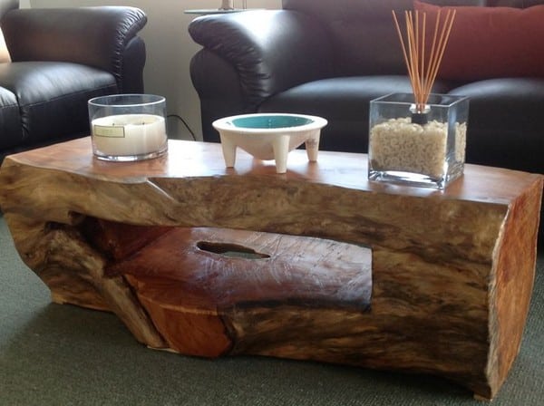 A log-based coffee table makes for a striking centerpiece in any living room. Pair it with a glass or wooden top for a functional yet artistic piece.