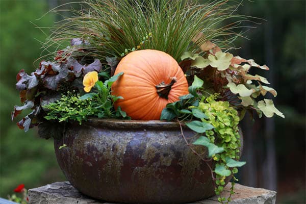 Create a container garden inside a hollowed-out pumpkin for a fun, seasonal touch. Fill it with mini mums, sedums, and ornamental grasses for a stunning autumn centerpiece.
