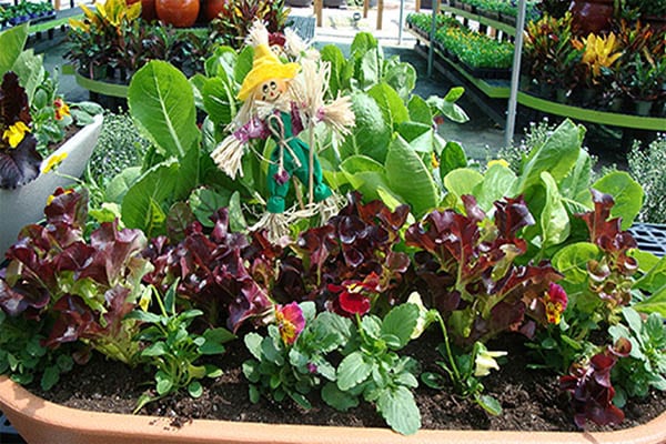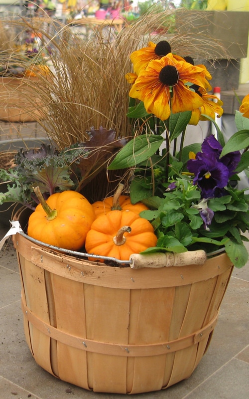 Mix ornamental gourds with cabbage, kale, and small chrysanthemums for a beautiful harvest-themed container. This arrangement brings the feel of an autumn farmerβs market right to your doorstep!