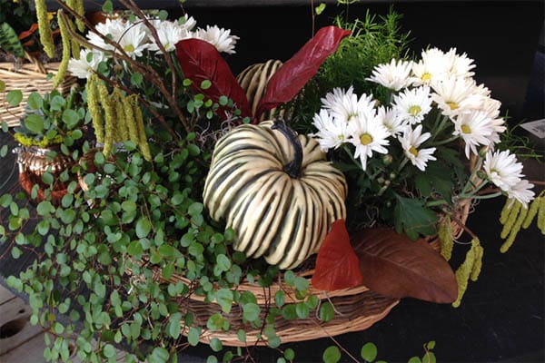 Brighten up your space by combining white daisies, orange pumpkins, and variegated ivy in a large, rustic pot.