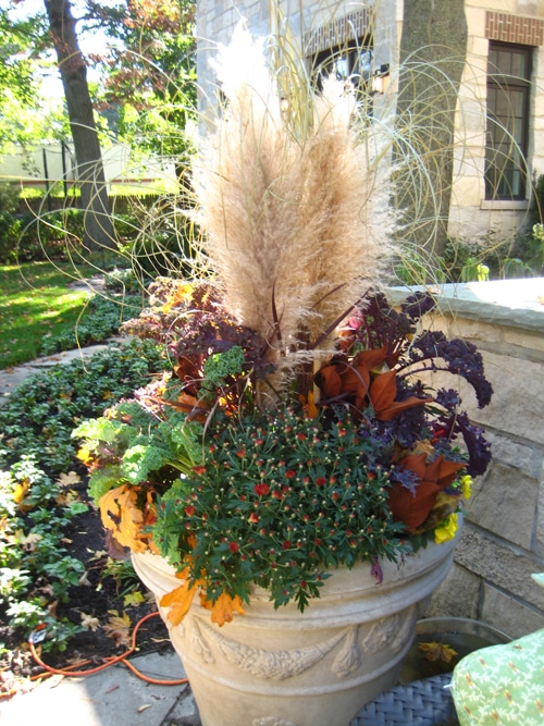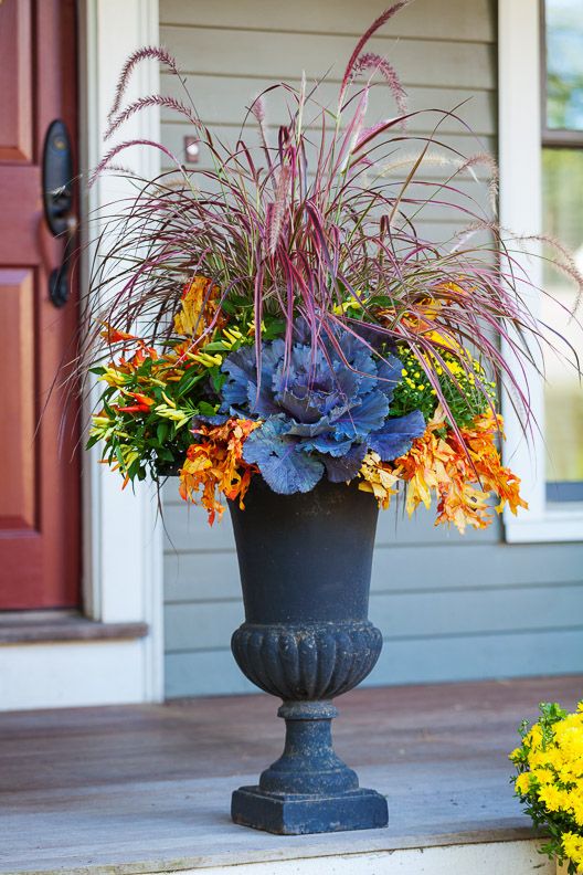 Combine rust-colored mums, ornamental kale, goldenrod, and cascading ivy for a perfect fall planter.