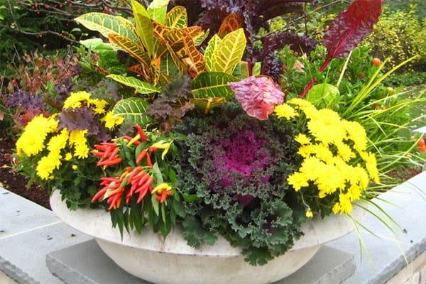 Use a mix of traditional and non-traditional fall plants such as ornamental peppers, crotons, and colorful succulents to create a unique autumn container arrangement.