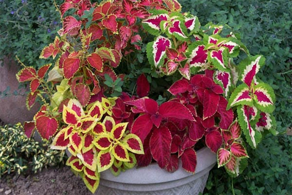 A deep, burgundy color palette creates an elegant autumn look. Combine maroon chrysanthemums, purple fountain grass, coral bells (heuchera), and deep red coleus for a rich, dramatic planter.