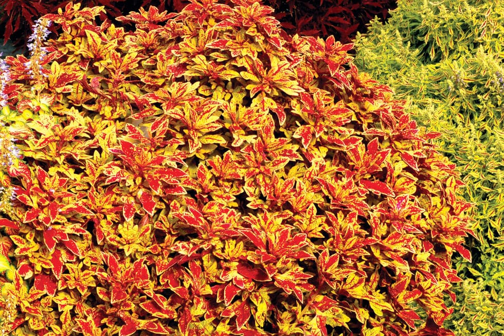 With its bold, fiery colors, this shade-loving coleus is a showstopper in hanging baskets, containers, or garden beds.