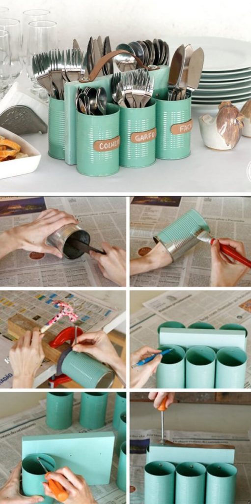 Turn turquoise-painted tin cans into DIY cutlery holders for outdoor dining.