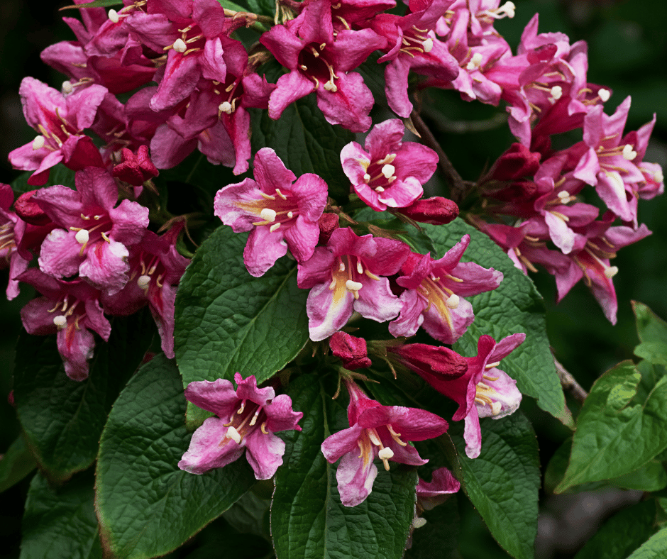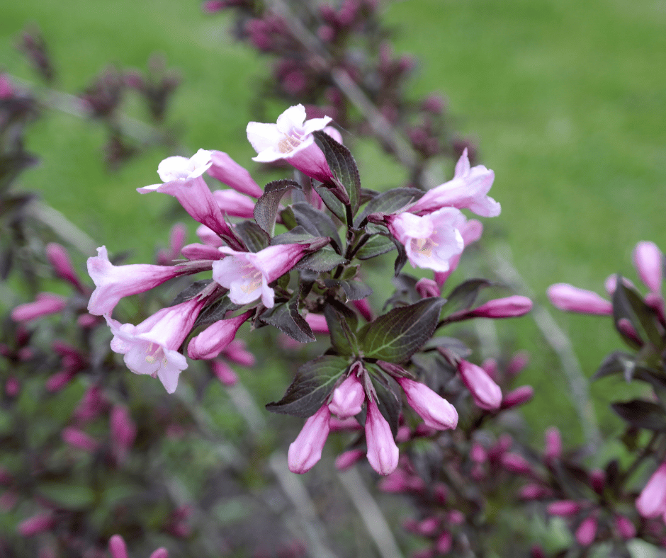 A lesser-known beauty, weigela produces trumpet-shaped blooms in early summer. Purple cultivars like ‘Wine and Roses’ have dark foliage that contrasts beautifully with its pink-purple flowers.