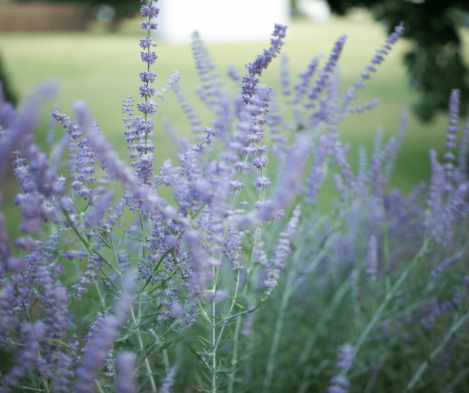 Not a true sage, but this airy shrub blooms from summer into fall with tall spires of lavender-blue flowers and silvery foliage.