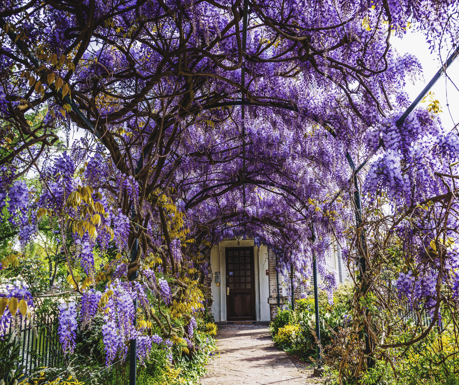 Although usually grown as a climbing vine, wisteria can be trained into shrub or tree forms. Its cascading purple flowers are breathtaking in spring.