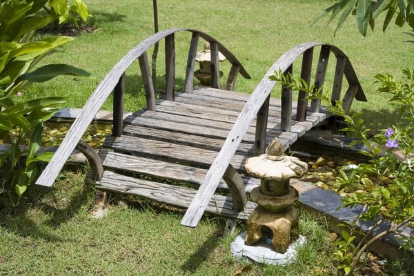 A classic wooden garden bridge with a graceful arch can serve as a focal point in your landscape.