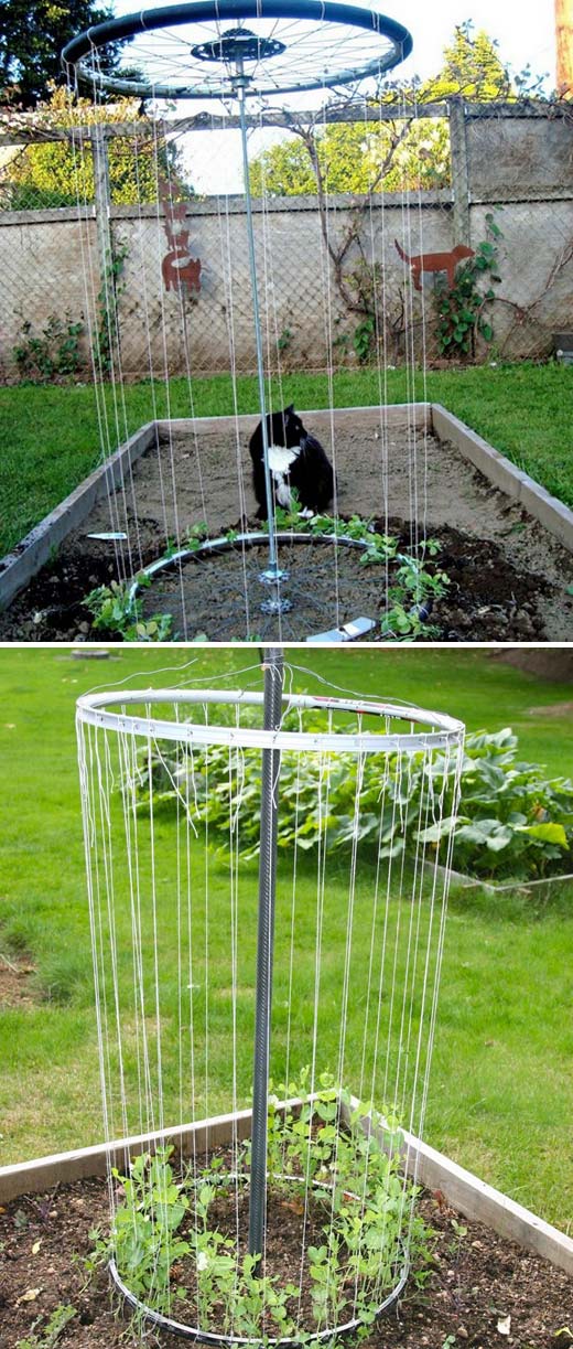 Turn old bicycle rims into a circular trellis structure. Attach them to a pole or stake them vertically to form a whimsical support for vines.