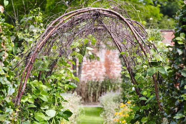 Create a teepee trellis using long bamboo stakes or wooden poles tied together at the top. Not only does it offer excellent support for climbing beans, but it can also double as a magical little hideout for kids.