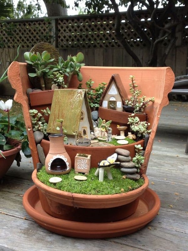 Instead of throwing away a broken clay pot, turn it into a fairy house with multiple levels!