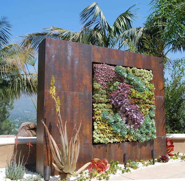 Use rusted steel panels or repurposed metal containers to build a vertical succulent garden.